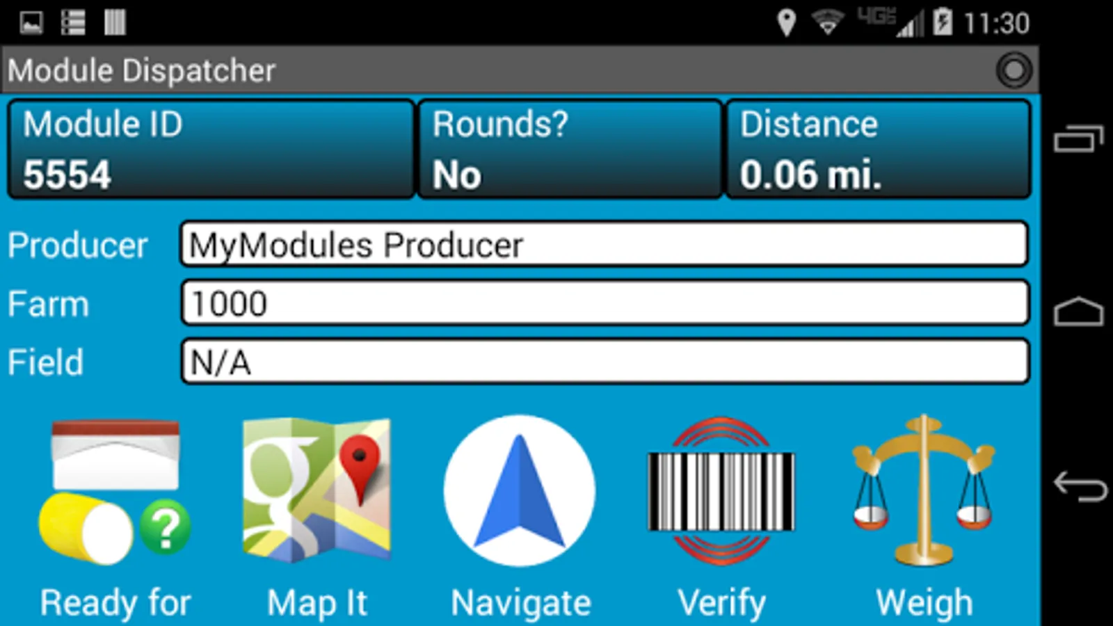 See a map of the module location. Navigate directly to the module. Verify the module via barcode or RFID scanning. Initiate the weigh-in process back at the gin directly from the app.