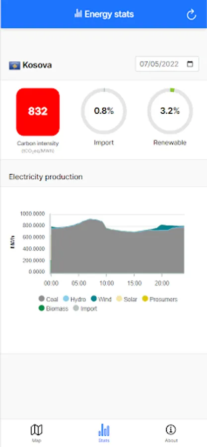 KosovoElectricityProduction.app shows in real time the structure and source of electricity production in Kosovo by presenting in graphic form the structure of production (Lignite, Hydro, Wind, Sun and prosumers) along with imports based on energy sources.