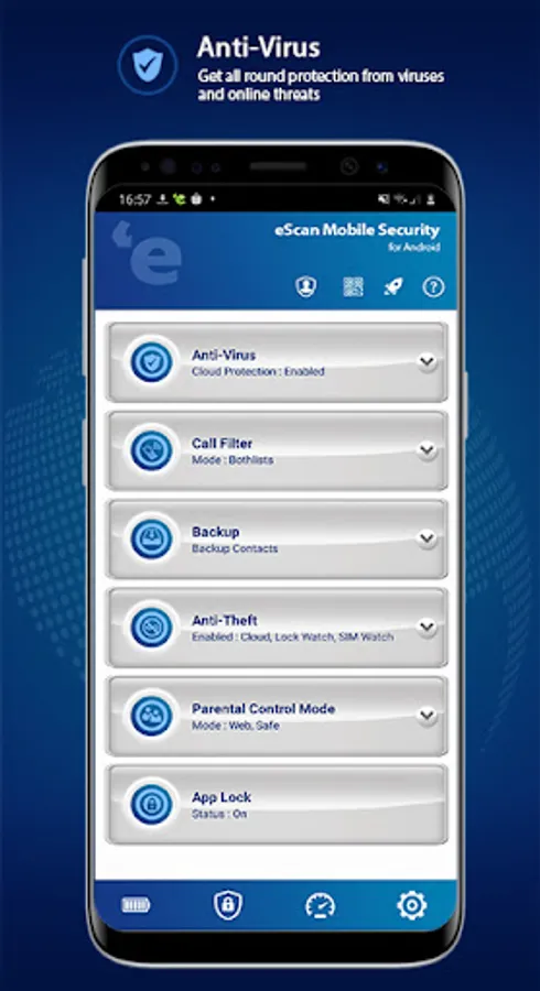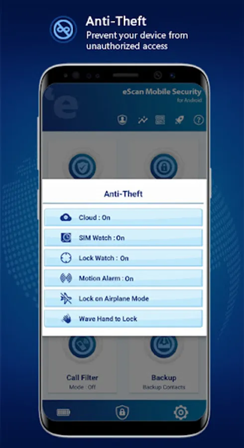 ✔ Anti-Theft: Anti-theft feature in eScan Mobile Security helps you lock and locate your device in case it is lost or stolen. This feature comes with options such as Lock, Data Wipe, Locate, Scream, SIM Watch, Lock Watch, Motion Alarm.