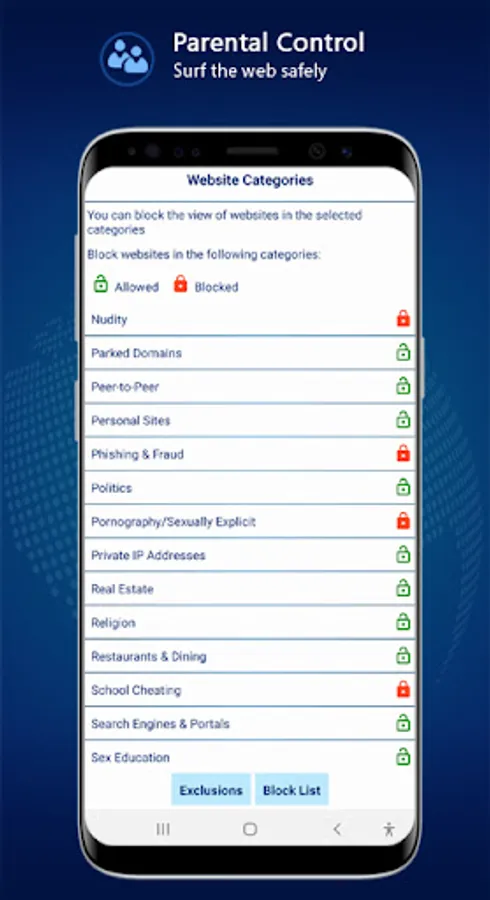 ✔ Parental Control: Allows blocking specific web sites and applications.