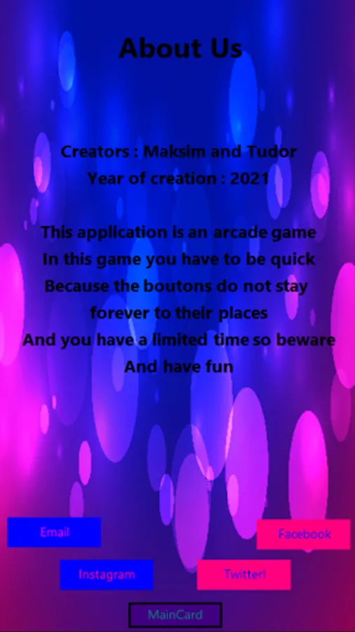 This app is an arcade game. Your game starts with the launching of the app and you have 12 seconds to reach the points that are asked for winning the game. To collect points you have to click on thinks which are similar to geometry figures. You will have 1 point if you click on a circle named "click me", 1000 points if you click on a rhombus named "bonus1000", 500 points if you click on a yellow star named "bonus500", 2000 points if you click on a purple star named "bonus2000" and 100 points will be subtracted from your score if you click on a square named "-100". Your score is always visible and you can reset him when clicking on a button named "reset points". You can multiplicate the points earned by clicking on an object by clicking 30 times on the subject "click me". If you earn the required points in 12 seconds, a message "Congratulations you win" will appear, if not then a message with the content "You lose try again" will appear instead.