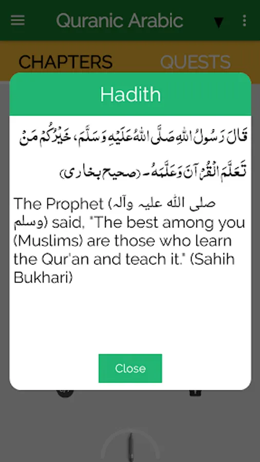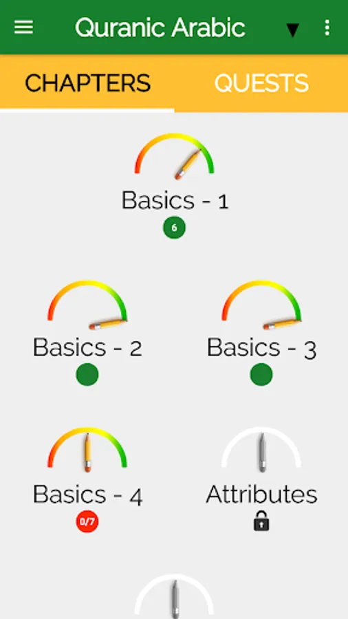 The first four chapters contain 25 lessons and more than 150 words, this makes about 46.5% vocabulary of the Holy Quran. These chapters are completely free and all the other chapters can be unlocked by spending Gold Coins that you earn while studying these lessons. If you are short on Gold Coins, you can buy them at a very low cost.