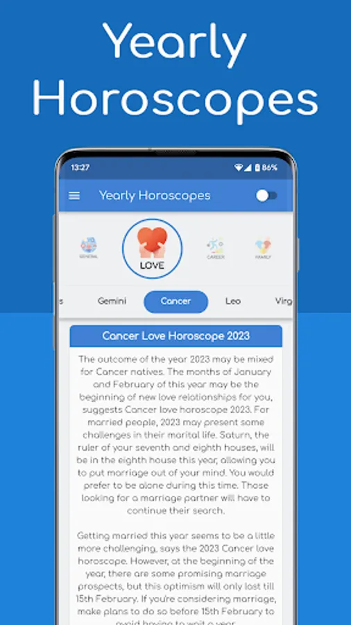 Daily horoscopes, Yearly horoscopes, each horoscope's personality expectation for love, work, wellness and family through the year.
