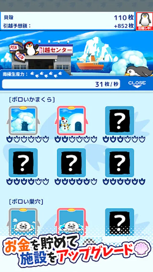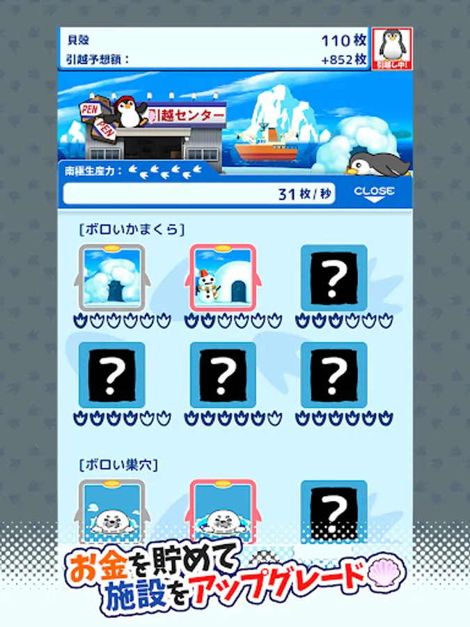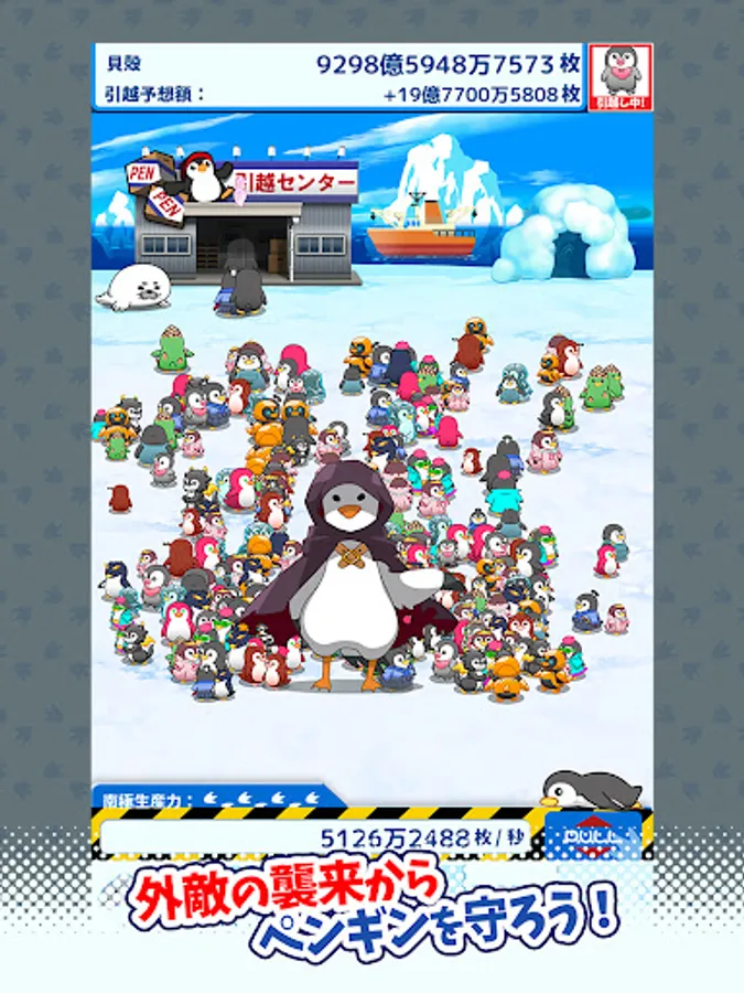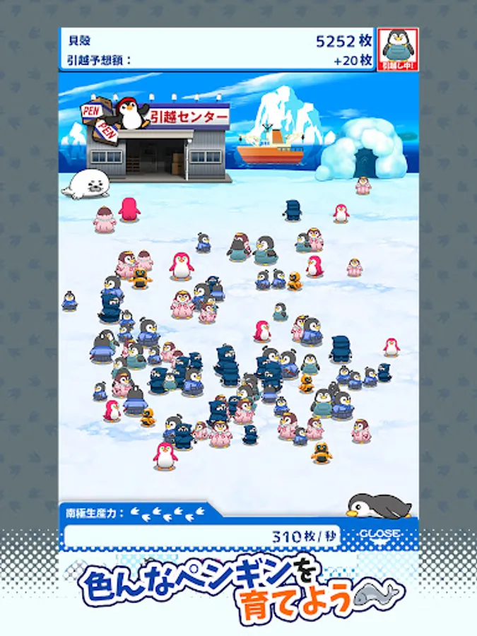 Touch the penguins that keep coming out of the kamakura, feed them, grow them, send them to the moving center, and tap the Antarctic ship to make them move!