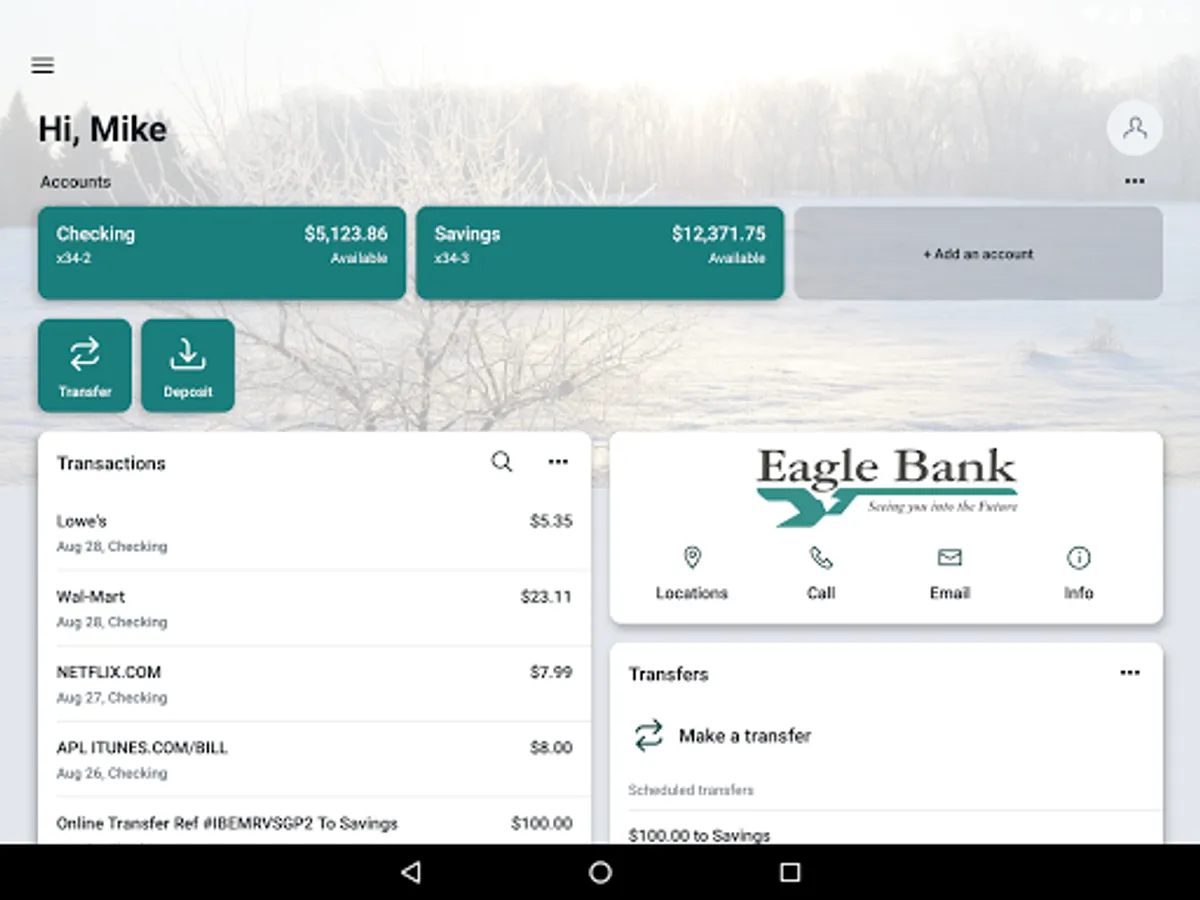 Eagle Bank Mobile Banking is available with an Eagle Secure, Eagle Rewards, Eagle Student, or Eagle Senior checking account.