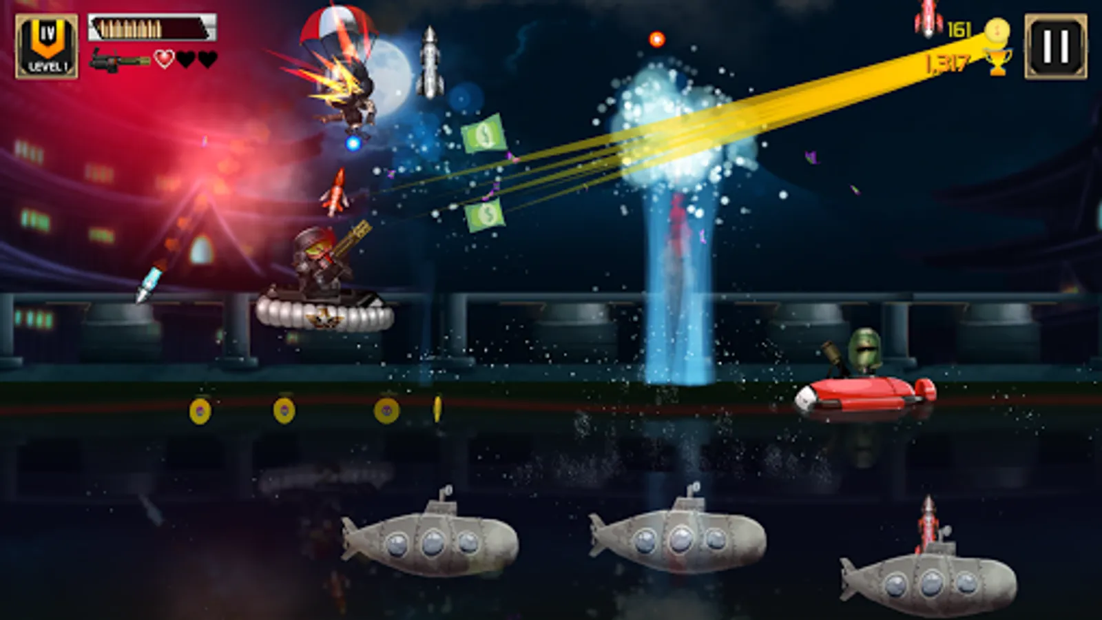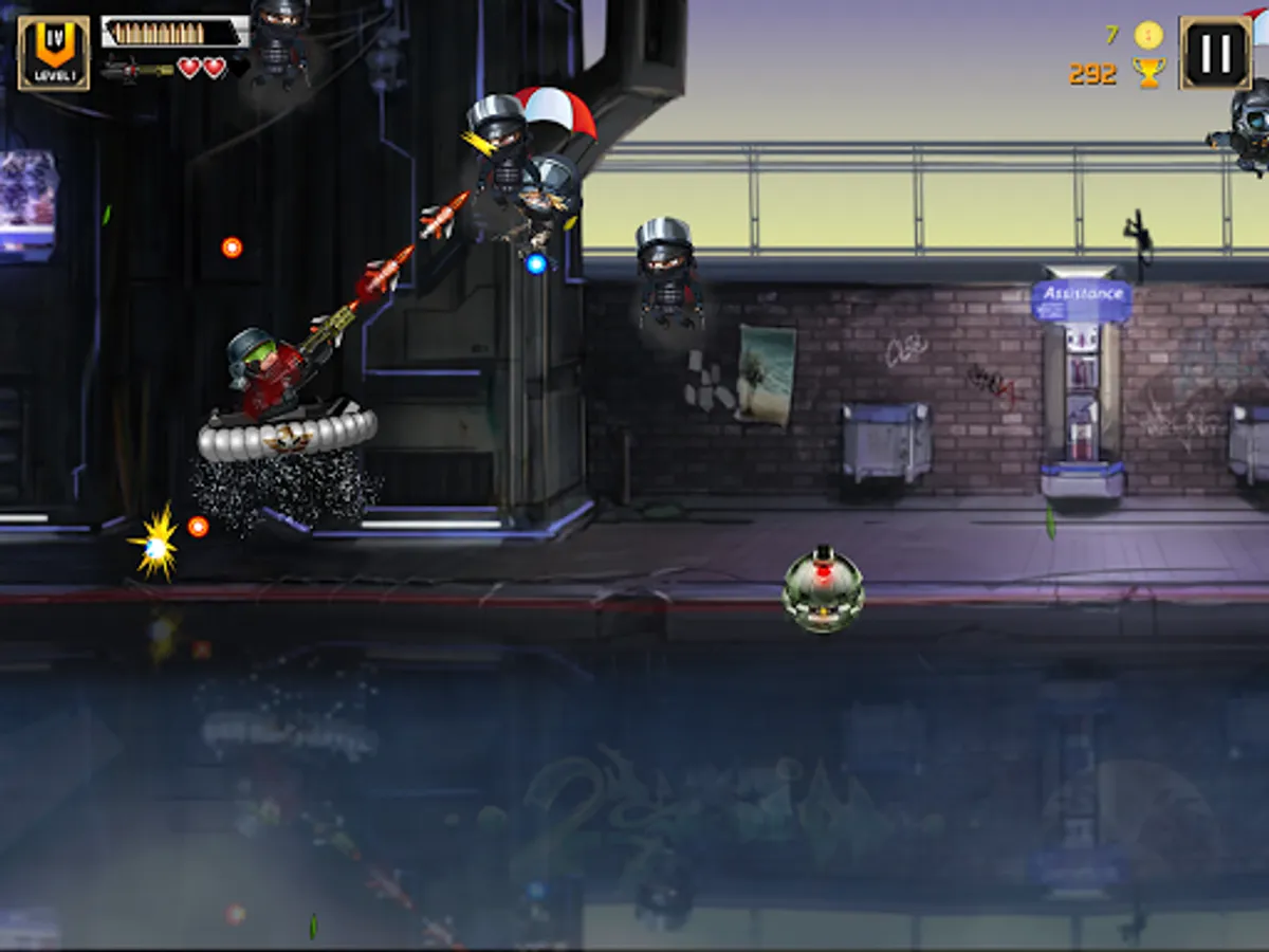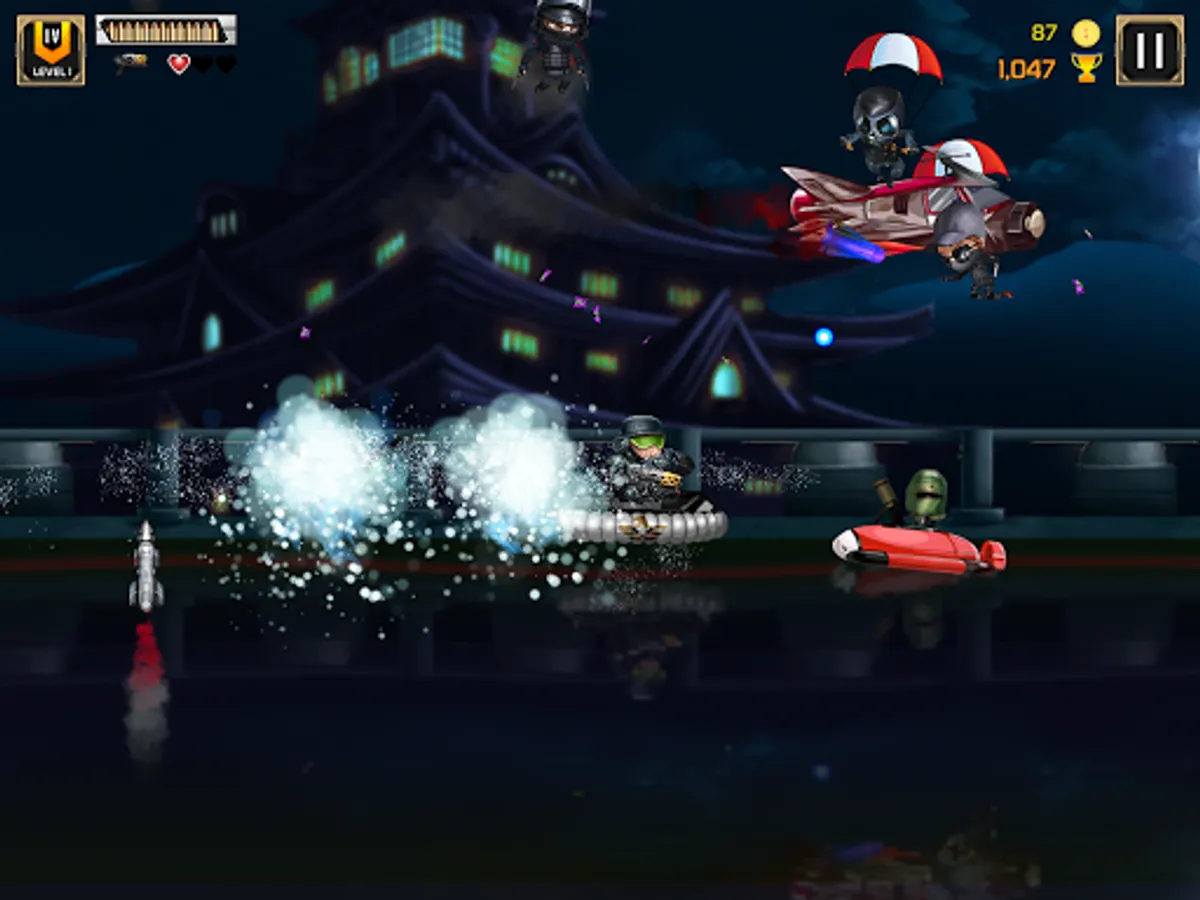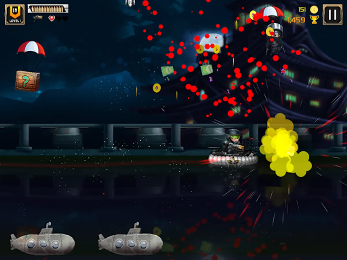 Players will use the Swipe Up to jump, Swipe Down to dive and Hold to move forward, the task is to pass stages with 7 types of enemies: Normal enemies, following enemies, boat enemies, submarines, helicopters, bombers, mines. Along the way, players can collect coins and gun items at the same time.