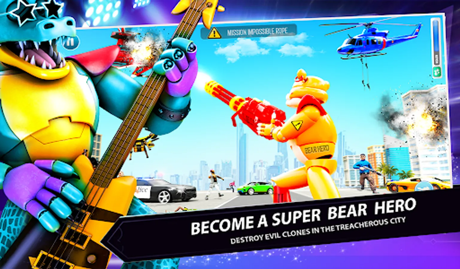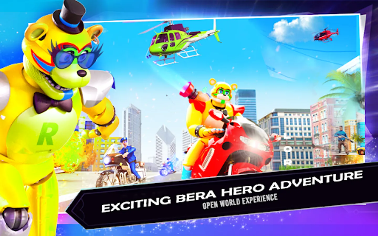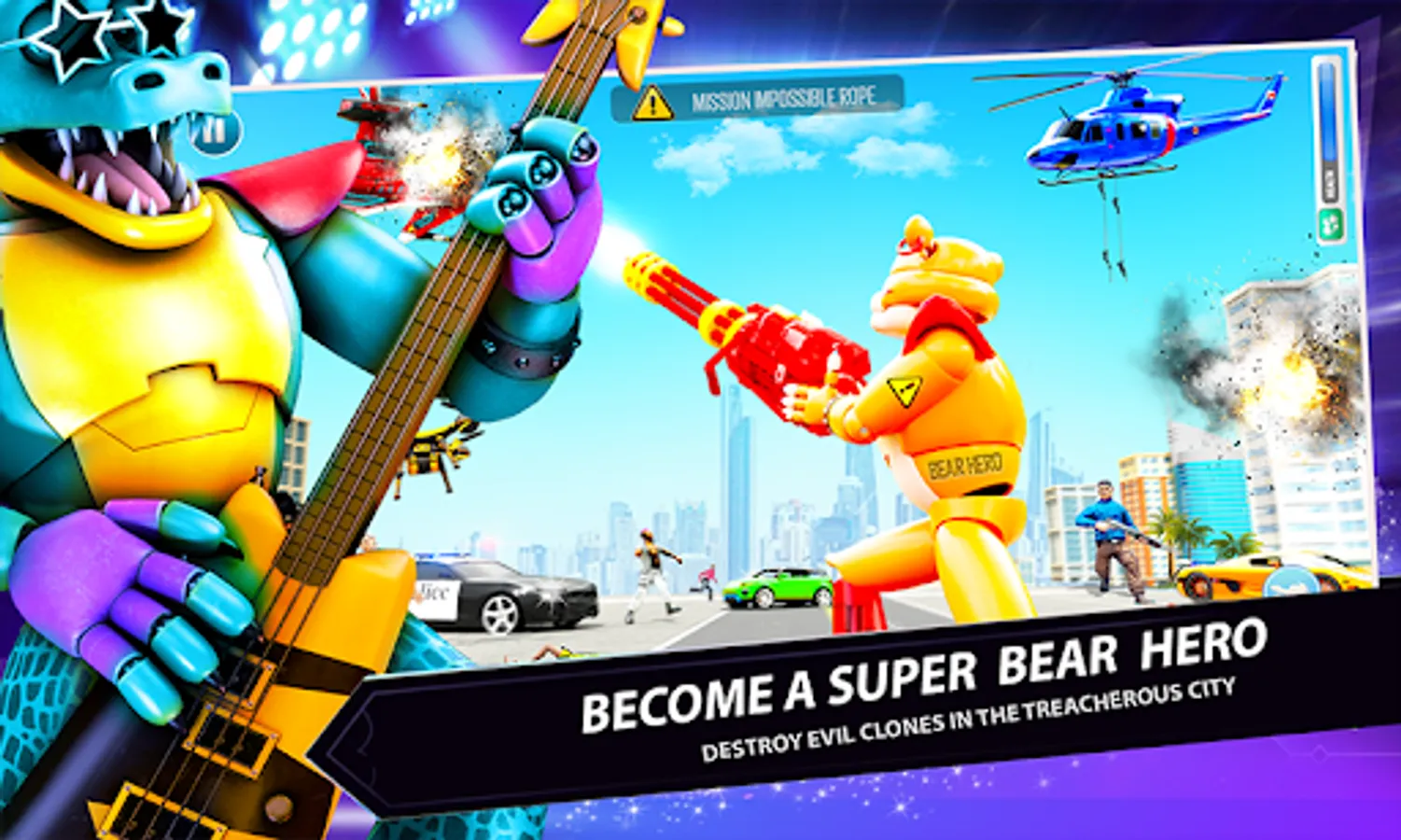 Being a bear party hero you are a super powers bearer and safety of your city depends on you. Its been six nights the scary creatures and evils monster have escaped and are killing. Superhero games with bear part hero city simulator to protect against security breaching from criminals and villains is an action and adventure thriller. As a superhero and part of legendary league against injustice. Its been five or six nights passed to security breachers of jail, do not fall down in catching criminals and you must be last one standing. Protect the people against security breach of city criminals to eradicate their evil plans with your bear hero wars skills and superpowers in this superhero game. Begin the grand city chase in this superhero simulator game as kingdom's inhabitants security depends on your bear hero skills and superpowers. Being a hero you must begin the war against evil teacher, horror creatures, and evil monsters. In this bear hero game you must catch all villain and criminals in grand city simulator with superhero might in superpowers game.