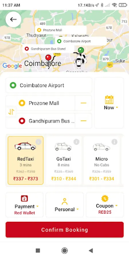 Red Taxi is available in Coimbatore, Tiruppur, Erode, Salem, Trichy, Madurai and Dindigul. See the upcoming list of cities where we operate at redtaxi.co.in