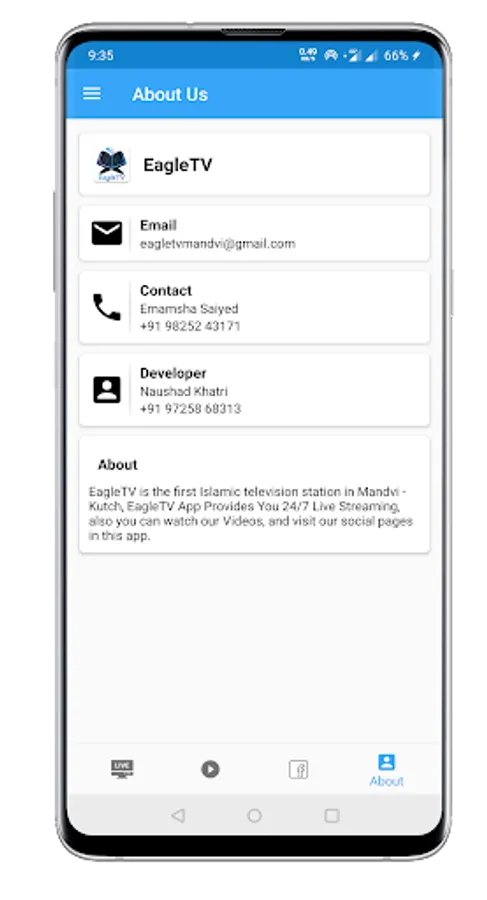 EagleTV is the first Islamic television station in Mandvi - Kutch, EagleTV App Provides You 24/7 Live Streaming, Latest Islamic Videos of Lectures & Naats, and visit our social pages in this app.