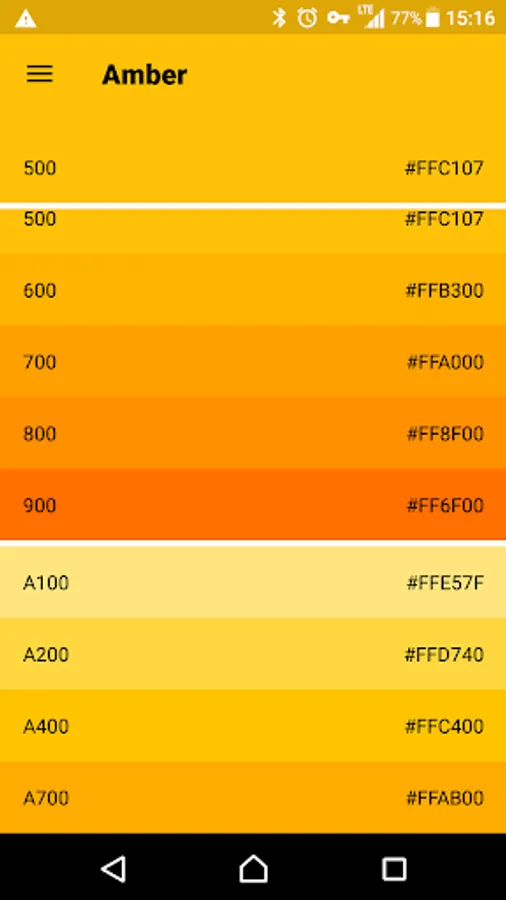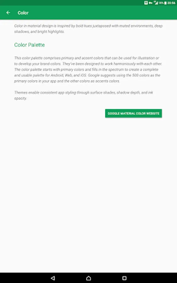 This color palette comprises primary and accent colors that can be used for illustration or to develop your brand colors. They’ve been designed to work harmoniously with each other. The color palette starts with primary colors and fills in the spectrum to create a complete and usable palette for Android, Web, and iOS. Google suggests using the 500 colors as the primary colors in your app and the other colors as accents colors.