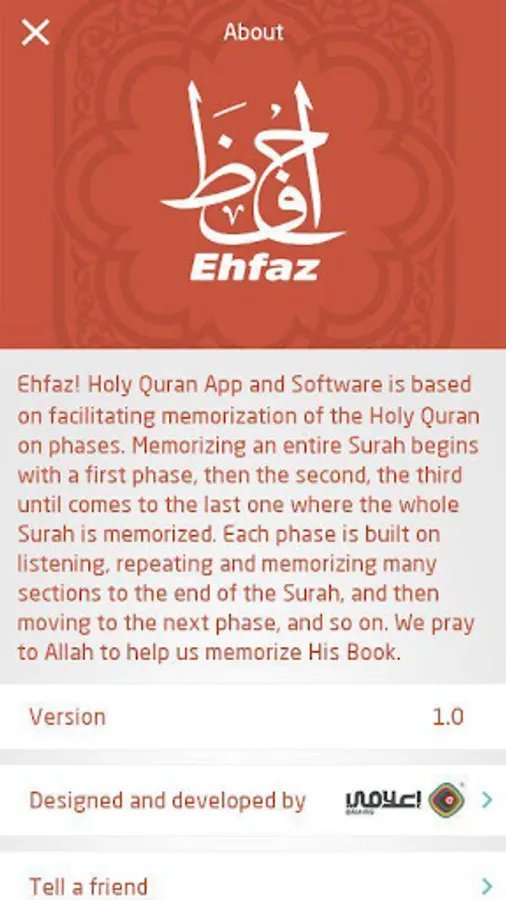 EHFAZ app is designed to facilitate memorization of the Holy Quran Surahs “chapters” using theLouh “tablet” method. Each Quran Surah “chapter” of more than 12 Ayahs “verses” is divided into several12-ayah tablets. Each Louh “tablet”is memorized in 6 phases. Each phase is composed of some sound clipsarranged in a hierarchy to facilitatelistening and repeating untilmemorization by the young, old, and non-Arab.