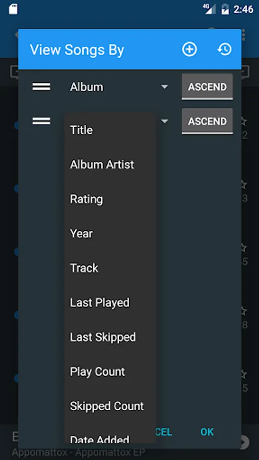 • Extensive sort options for songs. Any combination, ascending or descending: Title, Artist, Album, Rating, Year, Track, Filename, Last Played, Last Skipped, Play Count, Skip Count, Date Added