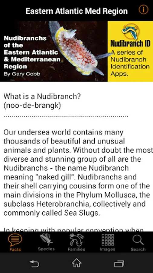 This field guide, which is updated when new names and information are presented, will place right at your fingertips, anytime and anywhere, the most comprehensive collection of all the known Nudibranch species to be found in Eastern Atlantic and Mediterranean waters. There are 744 species including color variations, from Norway and the Barents Sea down to the southern tip of Africa including the Mediterranean Sea. This is an area where marine fauna diversity ranges from tropical to lower temperate species. No web connection required.