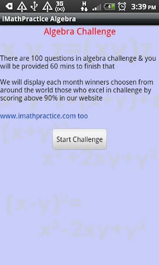 Under Algebra Challenge You will be prepared to compete with others. It contains 50 questions & time allotted is 1 hour.