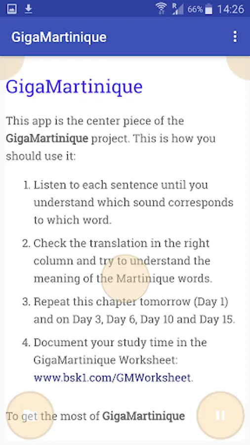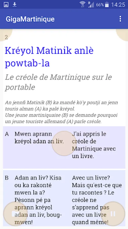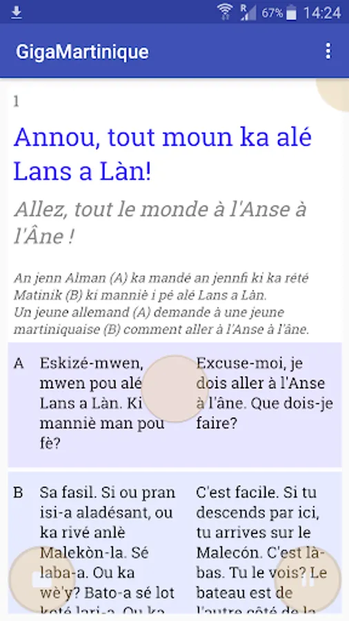 The cornerstone of the GigaMartinique method is a free smartphone application: www.bsk1.com/gigamartinique. Install it on your mobile devices, listen to the audios and display translations into