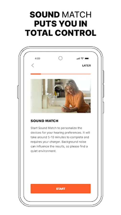 - Complete Eargo Sound Match to personalize your device to your unique hearing preferences. Sound Match appears automatically during first-time app use and can be accessed anytime from the app menu.