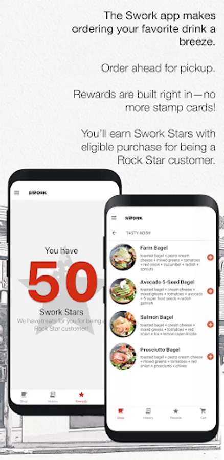 The Swork app makes ordering your favorite drink a breeze. Who wants to stand in line anyway? Am I right? Order ahead for pickup. Did you know that your next beverage may even be free! Rewards are built right in–no more stamp cards! You’ll earn Swork Stars with eligible purchase for being a Rock Star customer.