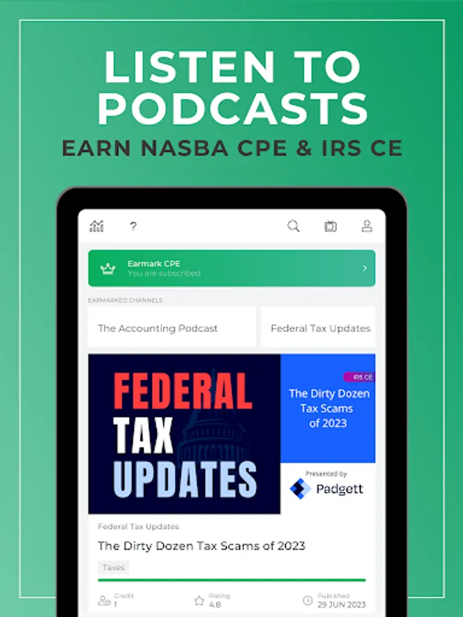 Earmark is a free, audio-based continuing professional education app for accounting and tax professionals, including CPAs, CMAs, and EAs.