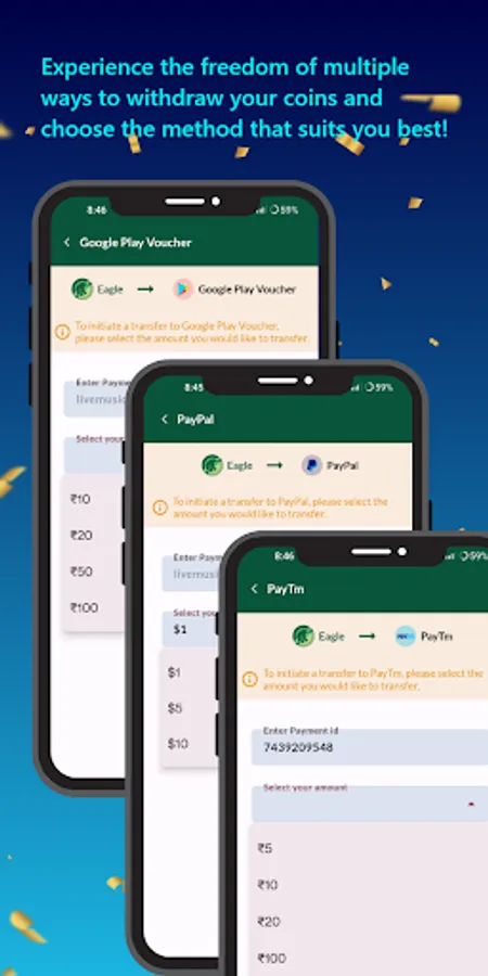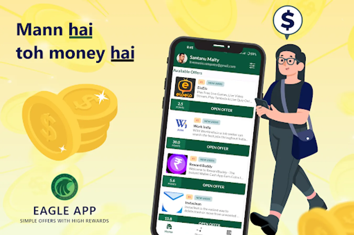 If you're seeking the best money-making app, your search has come to an end with the Eagle app. Earn instant rewards and wallet cash, and conveniently withdraw your money from your Eagle app wallet through Paytm, PayPal, Google Play Voucher, or UPI.