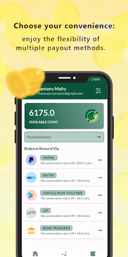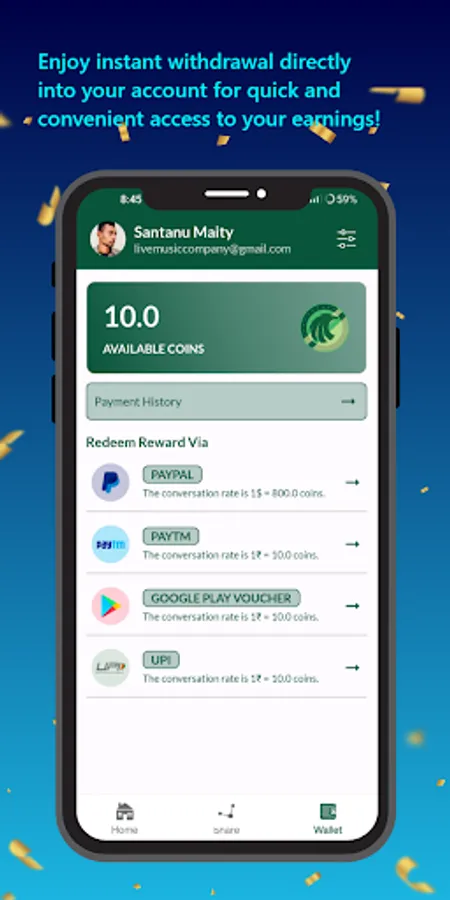 Every task, survey, or action you complete adds instant wallet rewards. Use these rewards to withdraw money immediately to your Paytm wallet, PayPal wallet, Google Play voucher, or UPI and earn thousands of coins effortlessly.
