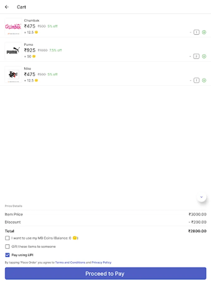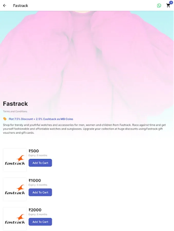Accessories :- Aldo gift cards, Bata, Charles & Keith, Fastrack, Helios, Hidesign, Hush Puppies, Joyalukkas, Kalyan, PC Jeweller, Puma, Tanishq, Titan, Voylla, BlueStone, Chumbak, Nike, Pavers England, Candere, Decathlon gift cards.