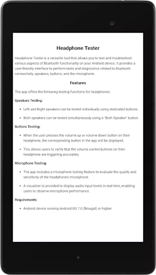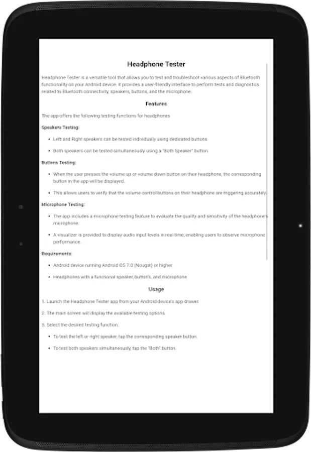 Headphone Tester is a versatile tool that allows you to test and troubleshoot various aspects of Bluetooth functionality on your Android device. It provides a user-friendly interface to perform tests and diagnostics related to Bluetooth connectivity, speakers, buttons, and the microphone.