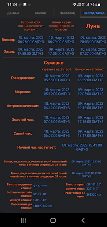 The program also provides sunrise/sunset information. Astronomical, navigational and civil twilight. The time when the golden, blue and night hour comes.