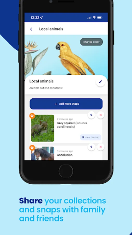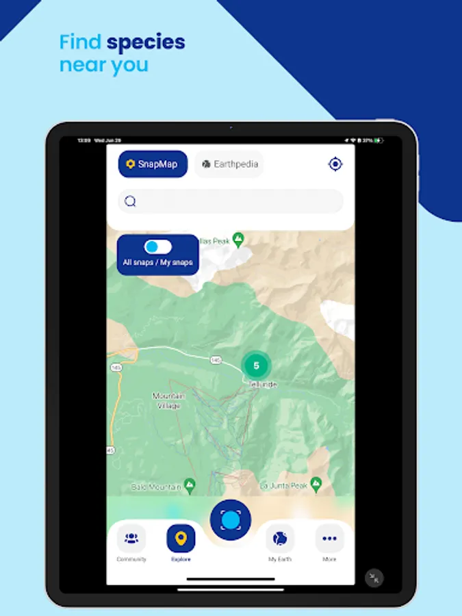 With the "Explore" function, you can use our SnapMap to find identified animals and plants anywhere on the planet. See the photos taken with EarthSnap and discover the different species of flowers, birds, trees, animals, mushrooms and any other living species spread around the world!