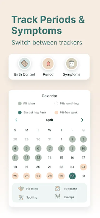 Track symptoms such as discharge, nausea, vomiting, bloating, and constipation as well as benefits of hormonal contraception such as natural period cycles, reduced cramps, improvement of PMS, and less acne.