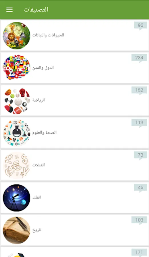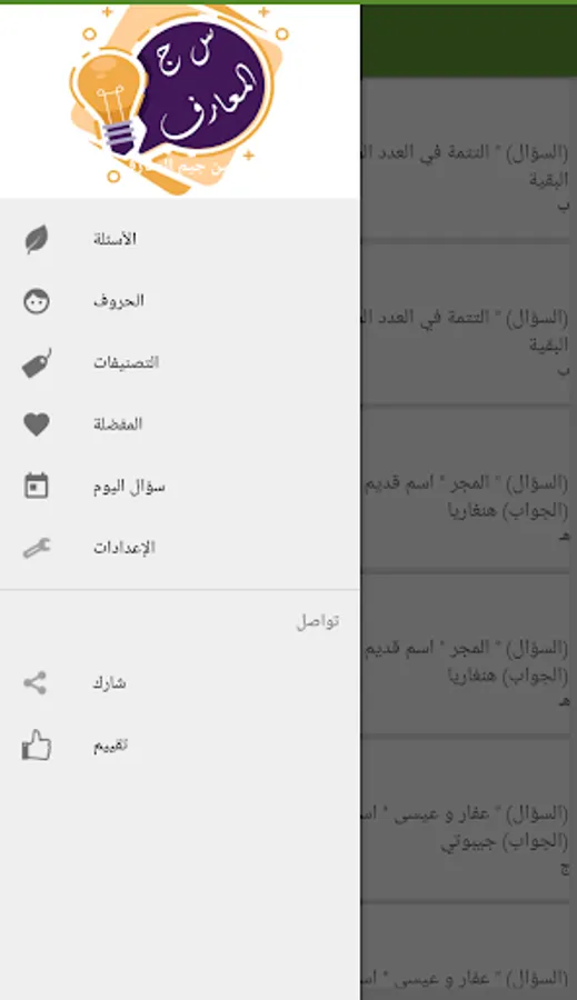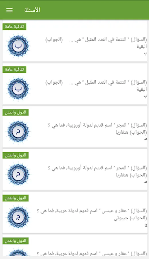 The application contains questions and its answers classified according to the nature of the question and also by the letter of the answer (excellent for the famous letters competition)