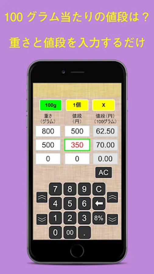 「グラムお幾ら?」は100グラムあたりの値段などを計算するアプリです。