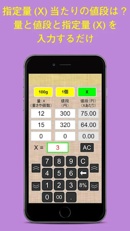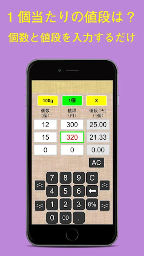 また、1個あたりの値段や、指定数あたりの値段の計算もできます。