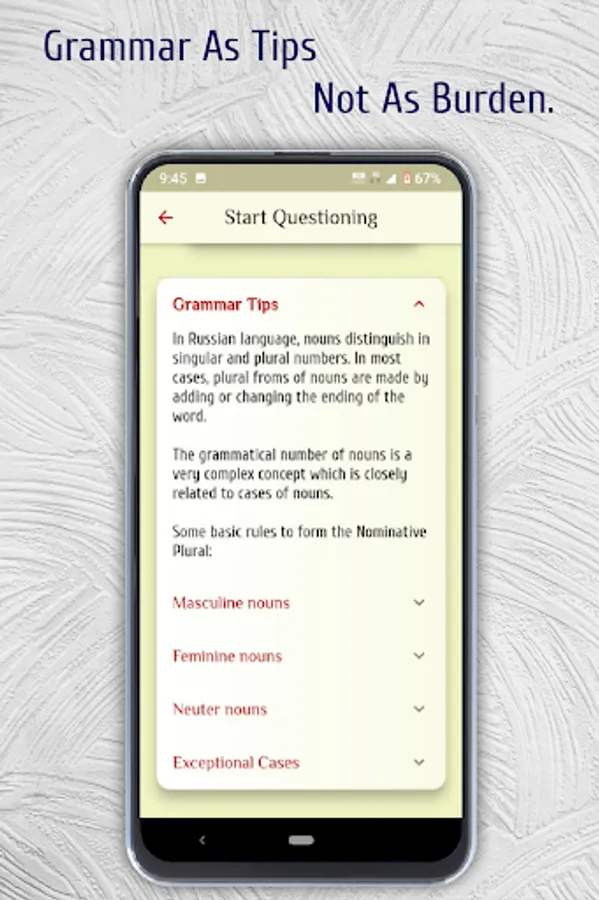 ✿ Last level will be mastery level which covers the parts of speech in Russian language, which includes Russian verbs, Russian adverbs, Russian adjectives, Russian prepositions and Russian conjunctions.