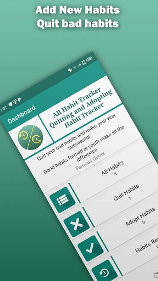 The habit tracker app is an easy to use tool with all information related to bad habits and good habits on main screen. All new habits are shown as soon as app is opened. Adapting good habits and tracking them is very easy using this habit app. Also tracking and preventing from bad habits allows user to be more productive.