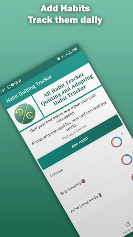 Habit adopter helps to adopt habits and add them to the app. Habits added can be viewed. Progress of new habits can be checked. Check new habits and there detail from the habit tracker within the app. Track habits and check them daily is much easier from the app.