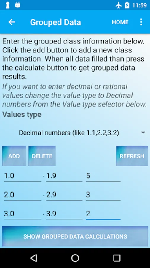 Grouped Data Calculations: This math solution app can perform calculations on grouped data using its statistical calculator.Write your grouped data values and get the calculation results. Get your grouped statistical calculations with mean,mode,median, skewness,etc.Statistical table is an arranged form to write data. Regression analysis app generates Statistical table on the basis of input. Statistical table contains frequency distribution,relative frequency,etc.
