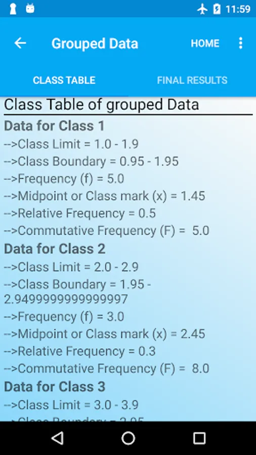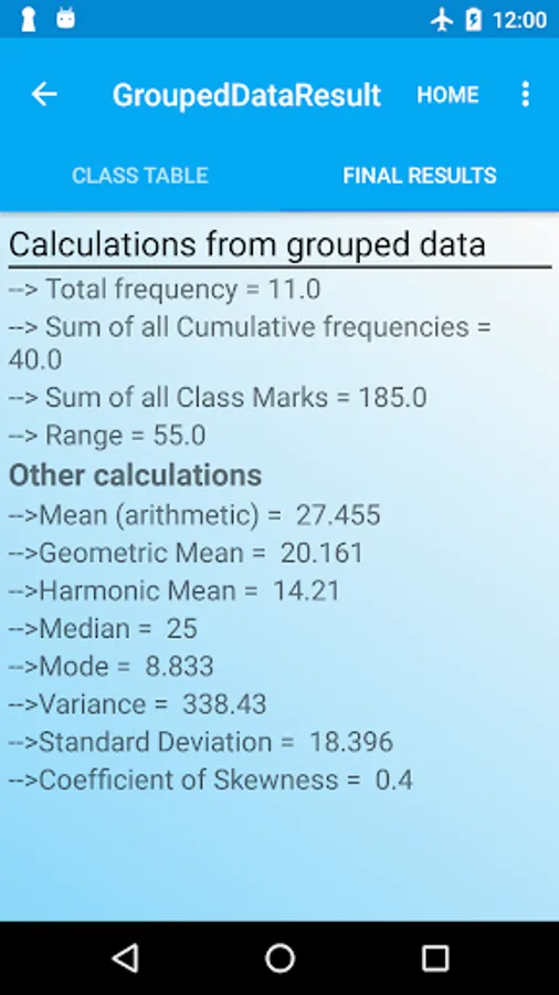 Ungrouped to Grouped data conversion:By using statistics app you can convert ungrouped data into to grouped statistical form and get the class table along with important results like median, skewness, etc using its statistical calculator.Statistical table is generated after converting the raw data. This stats calculator acts as a regression analysis app. Its an amazing statistics table app for math solutions.