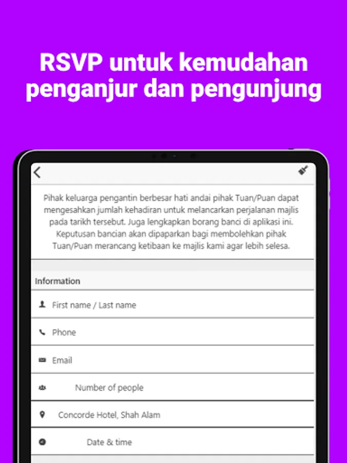 Andaikata tiada perubahan tarikh (syukur!), pihak kami juga akan memberikan "push notification" kepada pengguna untuk mengingatkan mereka tentang majlis yang akan diadakan. Oleh itu pihak tuan rumah/penganjur tidak perlu lagi menjalankan tugas tersebut.