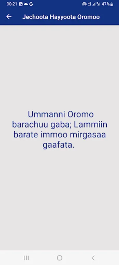 App kana keessatti Jechoota Hayyoota Oromoo hedduu argachuu dandeessu. Jecha Hayyoota wareegaman fi kanneen lubbuun jiranii of keessatti kan qabateedha. Akkasuma Jecha Oromootaa fi Jecha Qeerroo Oromoo of keessaa qaba.