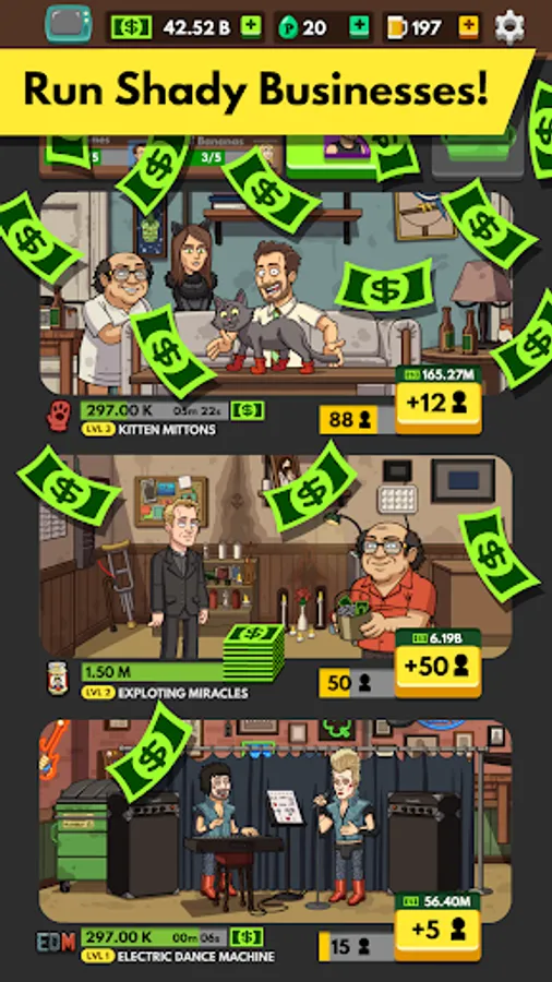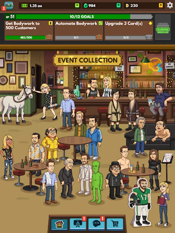 Transform all of The Gang’s crazy businesses into idle money-making machines! Idle clicker games are known for their relaxed play style. Automate businesses so that Mac, Dennis, Dee, Charlie and Frank can keep collecting cash even when you aren't playing. Upgrade characters and businesses by collecting cards that help you to increase the money-making capabilities of each idle business. With your help, The Gang will become true idle tycoons!
