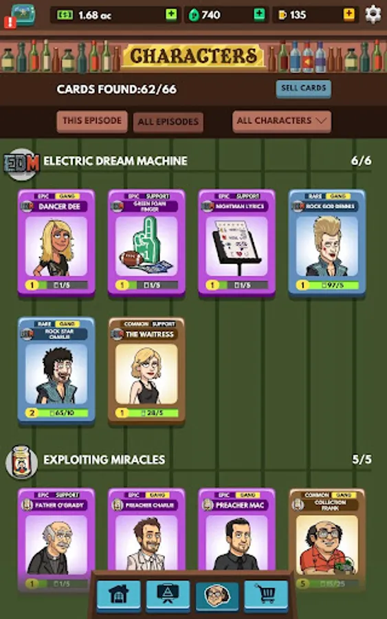 Tap, touch, and play with your favorite characters from the TV show, like Couch Frank, Wildcard Charlie, Erotic Memoirs Dennis, Fight Milk Mac, and Pink Eye Dee! Your favorite supporting characters are on fun new adventures, including The Waitress, Rickety Cricket, The McPoyles, and more (Rum Ham!!!)! Upgrade your characters and businesses to make even more money for Charlie to collect (and accidentally burn!).