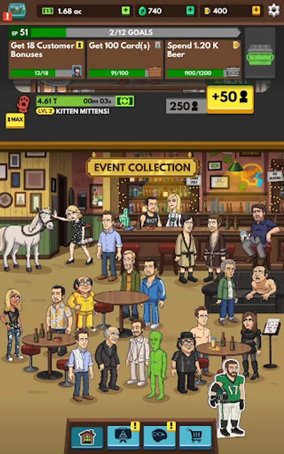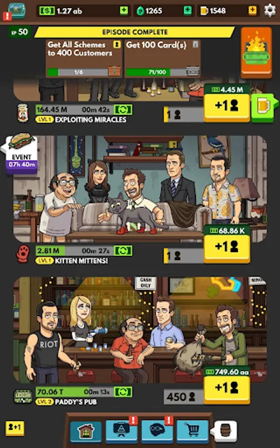 Manage Paddy’s Pub and cook up idle money-making schemes like Kitten Mittens, the Virgin Mary Stain, Electric Dream Machine, and more! Help the Gang exploit fools, backstab each other, give in to their worst impulses to convince hapless customers to hand over their cash! The more money you make, the more businesses you can build.