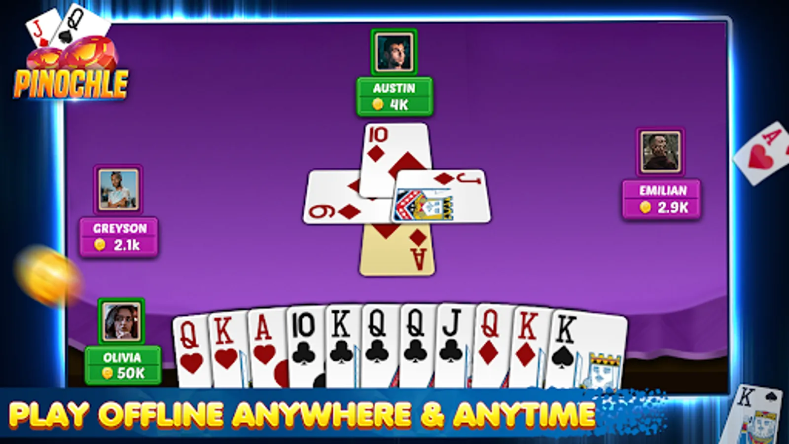 Pinochle, the trick-taking card game with lots of fun! Pinochle requires brains and a good memory. You can now experience it offline.