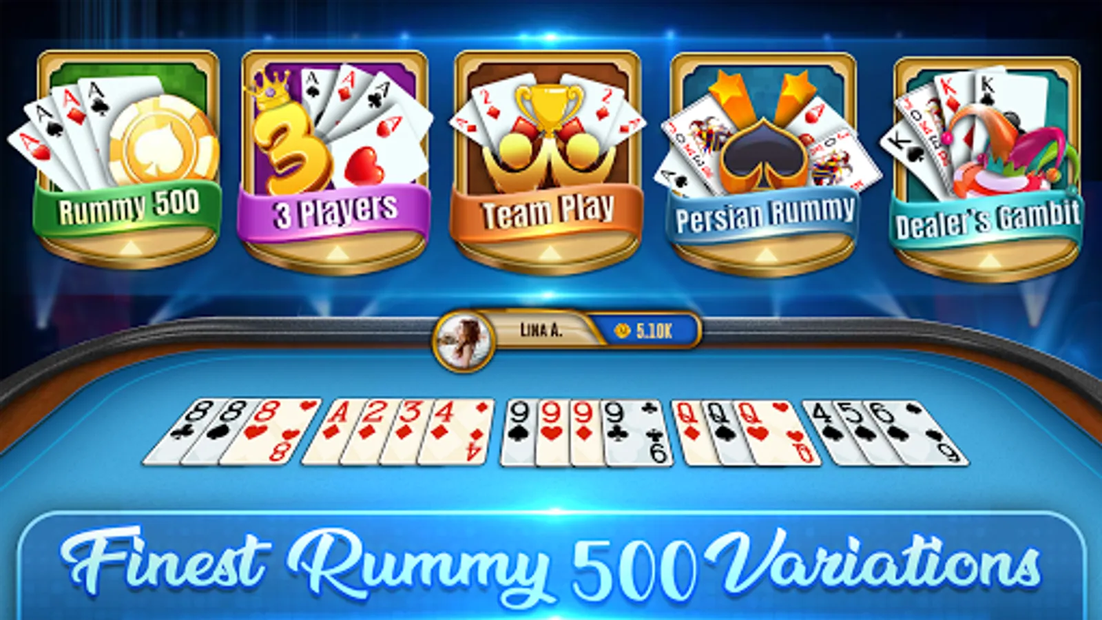 Rummy 500 (also known as Persian Rummy, Pinochle Rummy, 500 Rum, 500 Rummy) is a popular Rummy game which is similar to straight Rummy but distinct in the sense that players may draw more than just the upcard from the discard pile. This significantly increases the level of complexity and strategy involved in the course of play.