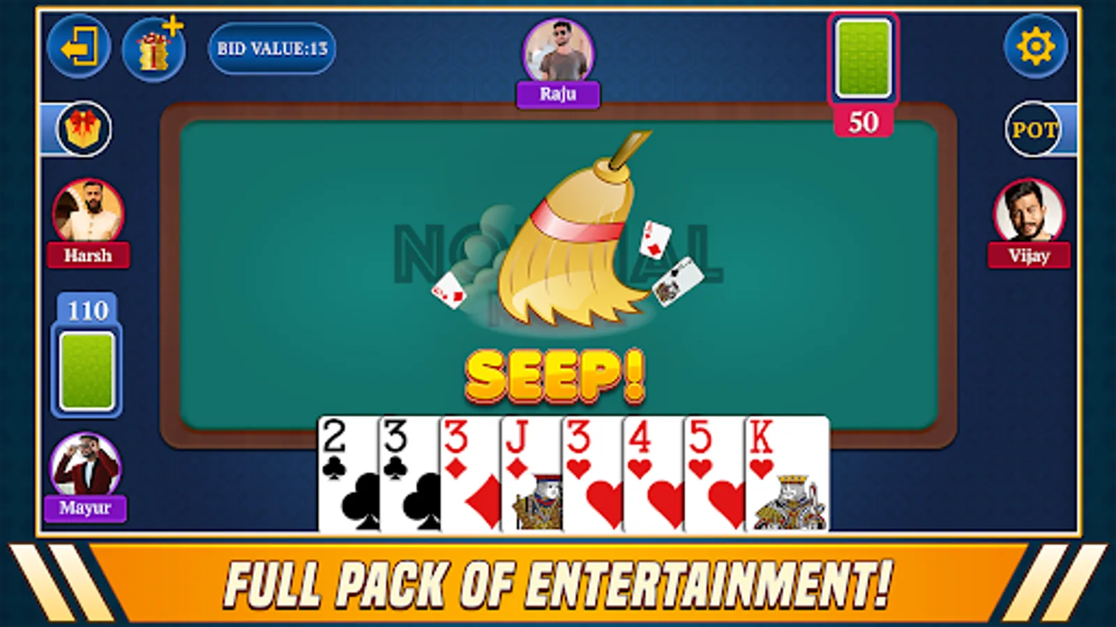 Seep is normally played by four people in fixed partnerships of two with partners sitting opposite one another. The deal and play are counter-clockwise.