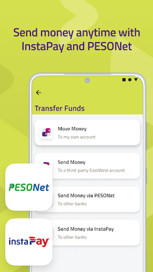 • Transfer funds to third-party EastWest account and to other local banks via InstaPay or PESONet