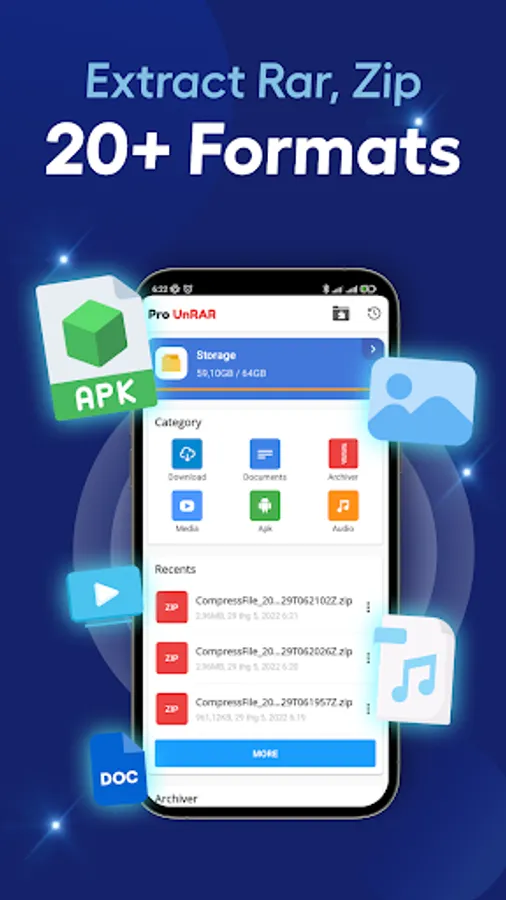 • Easy unzip, unrar & extract more than 25 different formats including 7ZIP, ZIPX, JAR, 7Z, TAR, ISO, GZ, TGZ, BZ2, BZ, TBZ, TBZ2, XZ, TXZ, LZ, TLZ, LZH, LHA, ARJ, TAZ, 001, etc, all file formats can be extracted with our Rar Zip 7z compression & extraction application