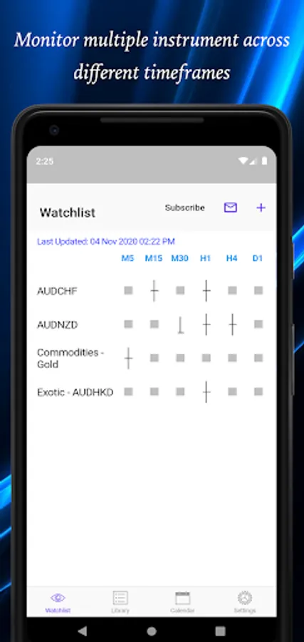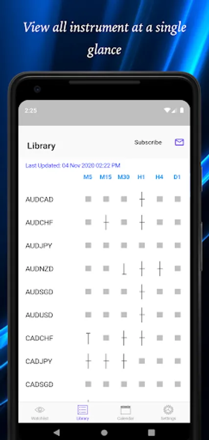 Easy Doji provides a comprehensive dashboard that allows you to view the presence of Doji formed over 37 currency pairs across 5 timeframes (M15, M30, H1, H4, D1) at one glance.
