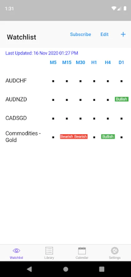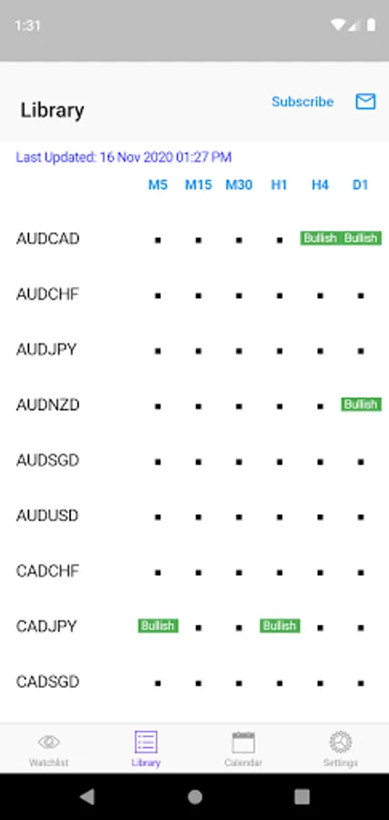 - Timely push notification alert of identified Engulfing pattern of your favourite instruments on your watch list (M5, M15, and M30 are only available for subscribers),