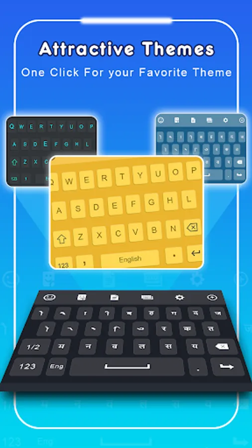 Easy & fast Hindi English keyboard with a variety of themes, you can switch between English & Hindi keyboard at any time, fast and easy Hindi typing keyboard than ever before, Hindi English language keyboard helps in typing Hindi & English alphabets in no time. You can change the theme at any time directly from the keyboard.